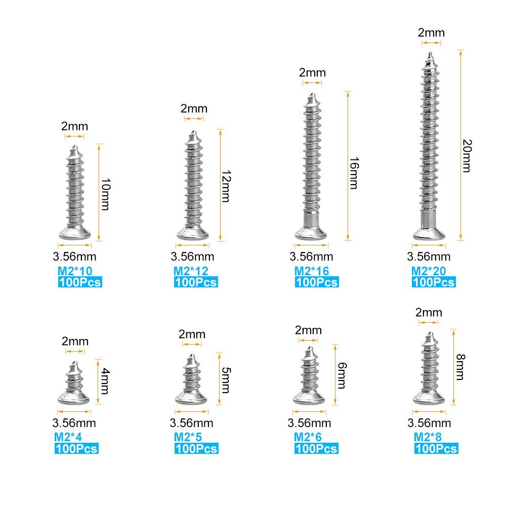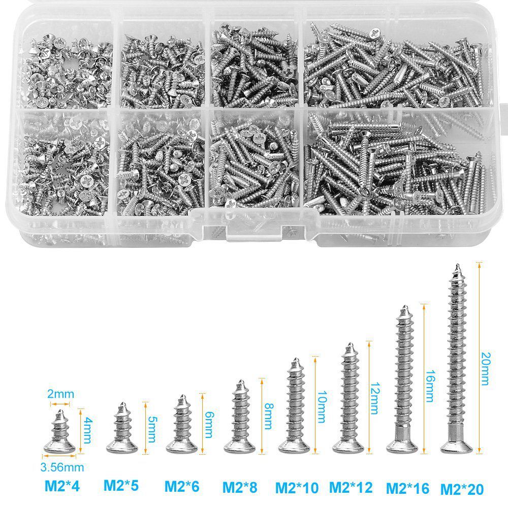 M2 Stainless Steel Self-tapping Screw Set – 800 Pieces Assorted Sizes with Organizer Box