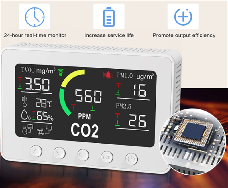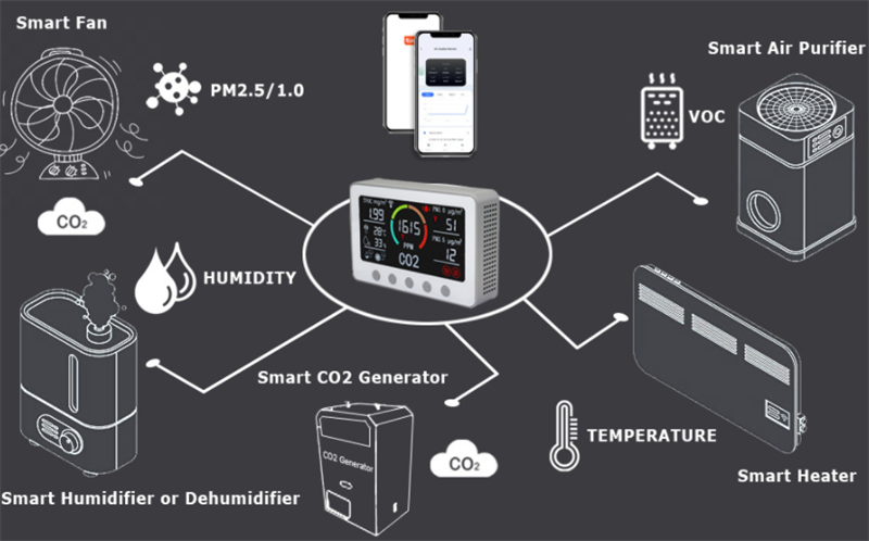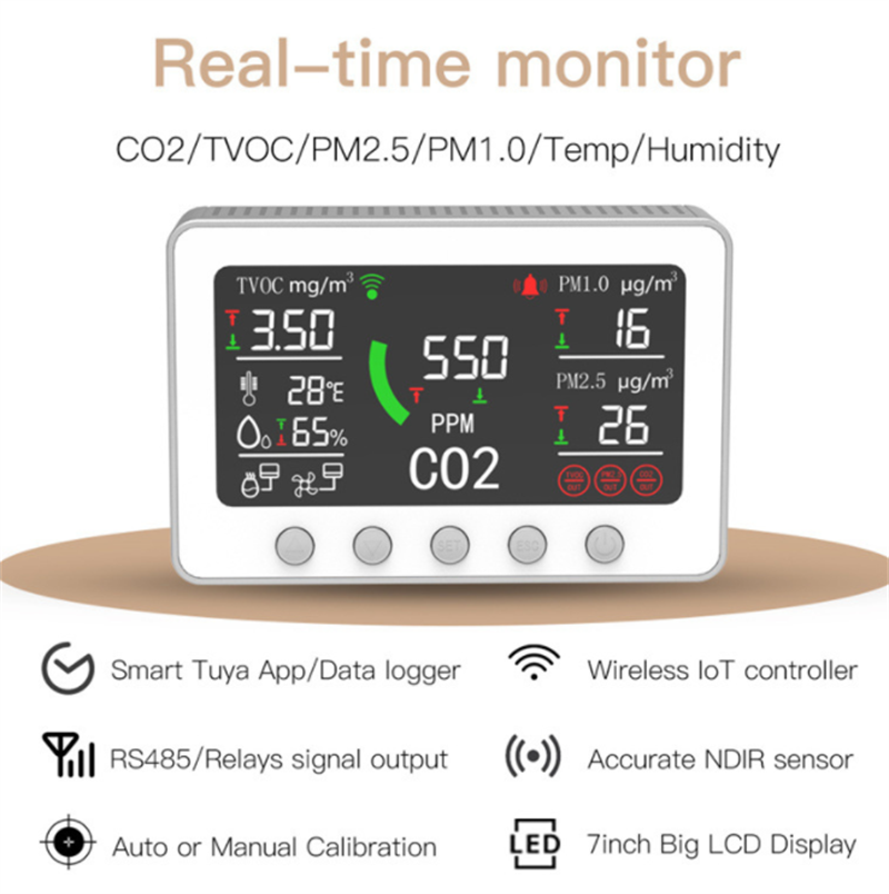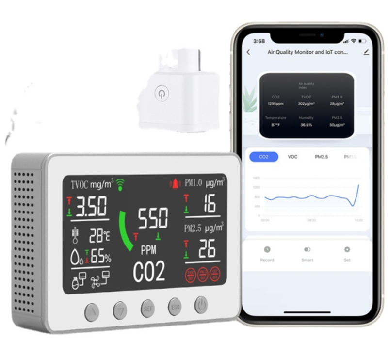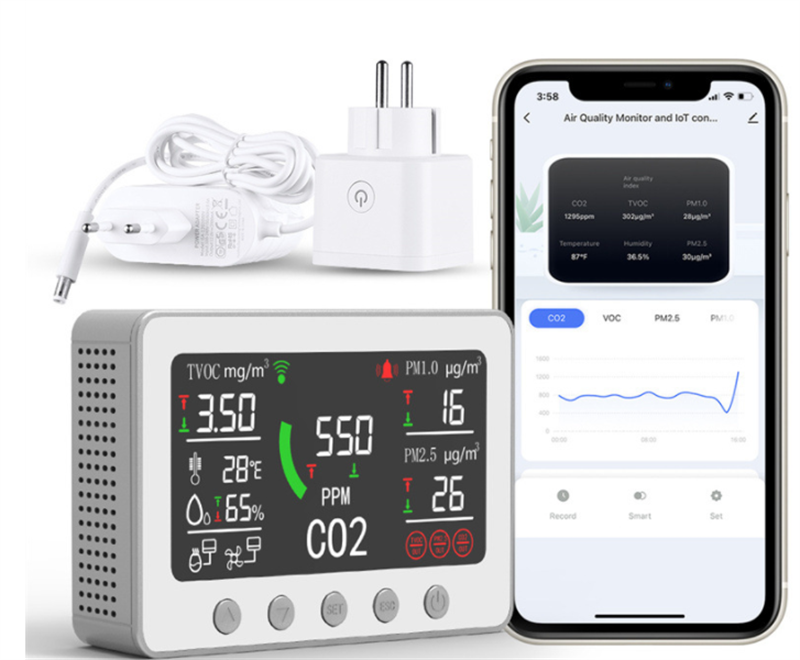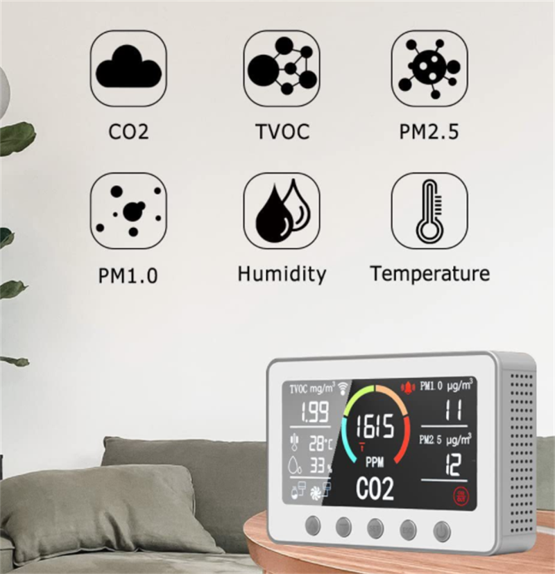 Measurement objects: CO2, PM1.0, PM2.5, TVOC, temperature, humidity, WIFI