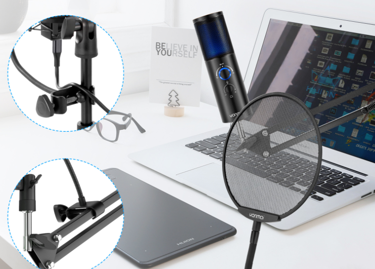 The thickness of the metal mesh produced by the new etching process is only 0.3mm. The thin and light design makes it more portable for users to use. The fine mesh has a better anti-spray effect and also has better permeability. Pennet users can also clearly see the working status of the microphone, making human-computer interaction clearer and highlighting the main body of the microphone. The design of the hose makes it easier for users to adjust the angle of use. The clip head with adjustable width can be fixed on brackets of different widths. As an accessory, it can protrude the microphone more.