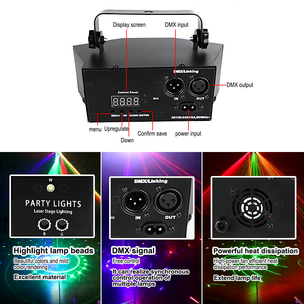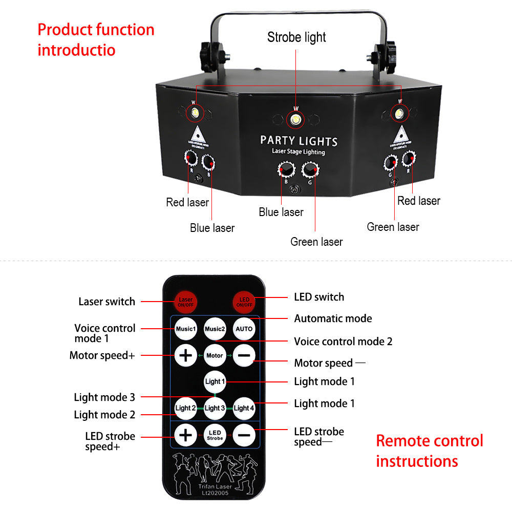 Remote control: The remote control can adjust the strobe, pattern, and sound control