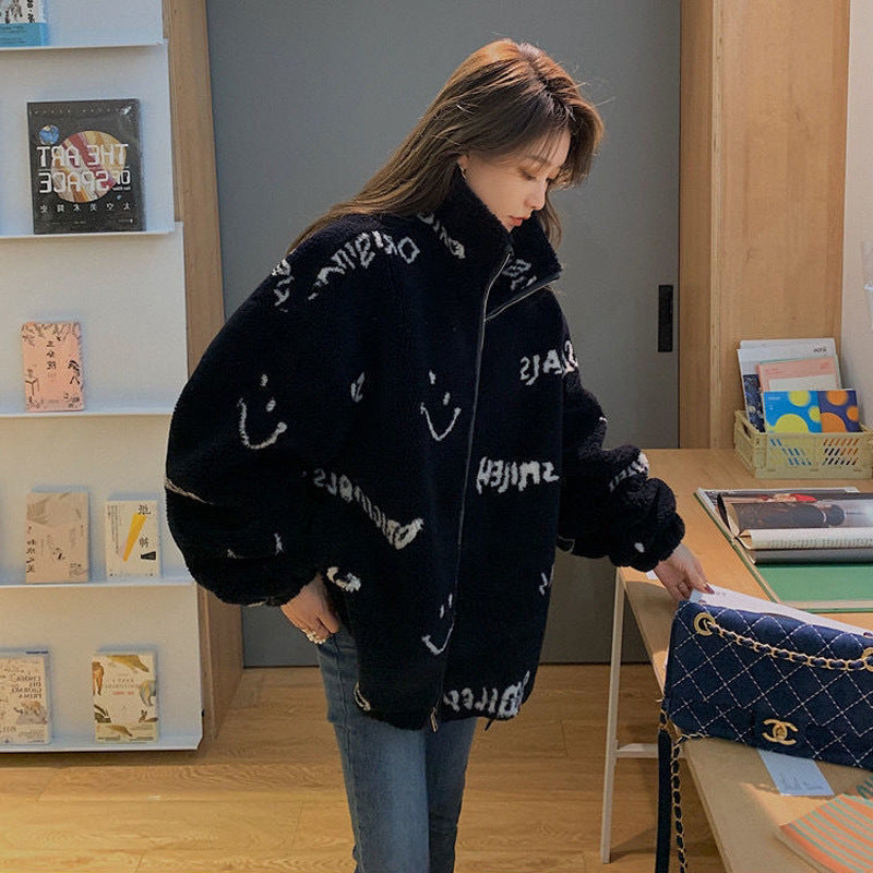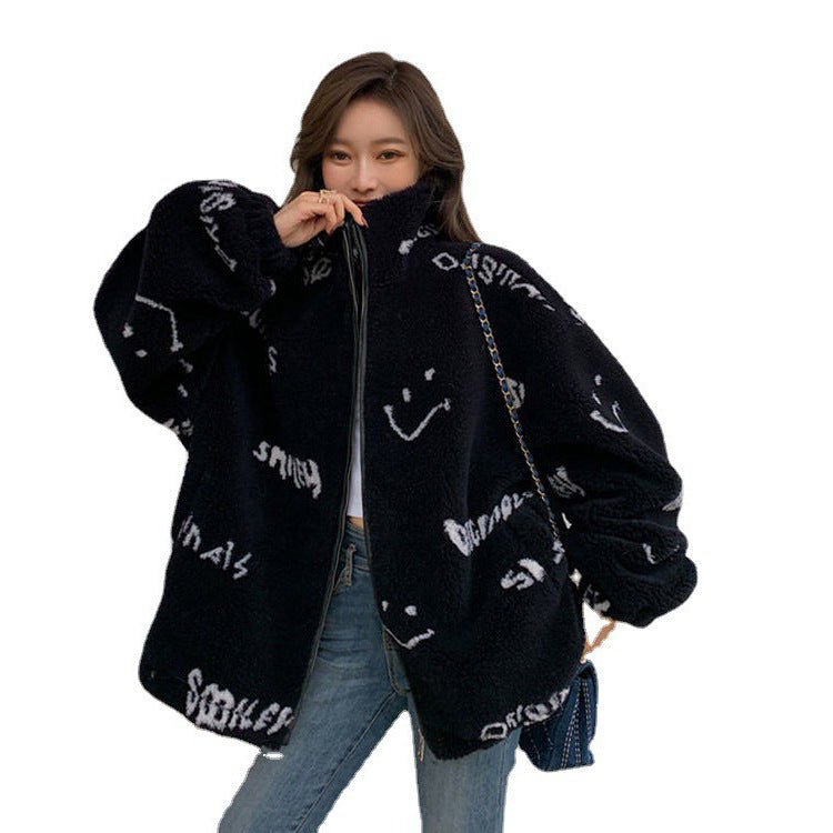 Thickened Sheep Shearing Letters, Loose Fashion Plush Jacket for Women