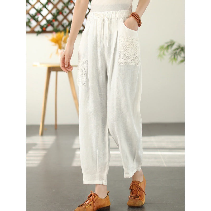 Women's Fashion, Literary Cotton Linen, Solid Color Lace Patch Harem Pants